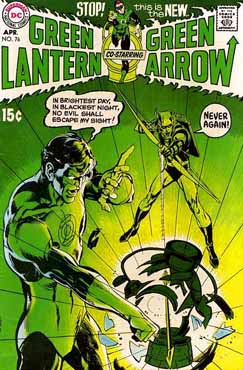With sales steadily declining, Green Lantern #76 marked a radical change, teaming GL up with Green Arrow, shortly after he’d been reinvented as a radical left-wing firebrand. The story opens when GL saves a man from street punks; Green Arrow informs him that the guy is actually a slumlord and the attackers were his righteously angry tenants. To cap that off, an old black man tells GL that while he’s apparently willing to help people in space with orange skins and blue skins “what have you done for the black skins?”